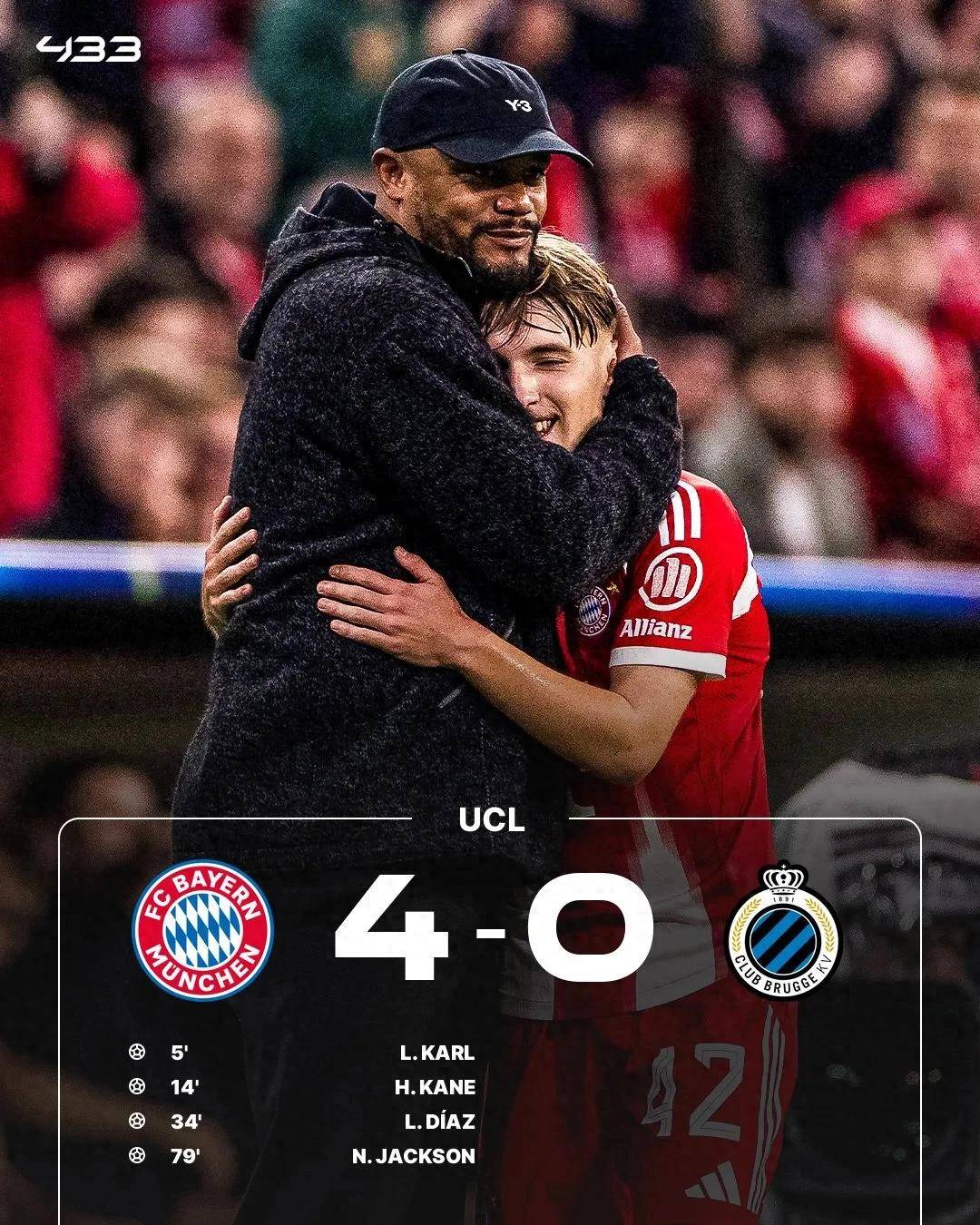 拜仁在主场迎战布鲁日,小将卡尔打入一线队首球,随后凯恩、迪亚斯和杰克逊接连破门,拜仁主场4-0大胜。凭借这场胜利,拜仁各项赛事豪取12连胜,状态正盛。本赛季,凯恩在仅12场俱乐部赛事中打进20球,刷新了梅西与C罗保持的同期纪录。